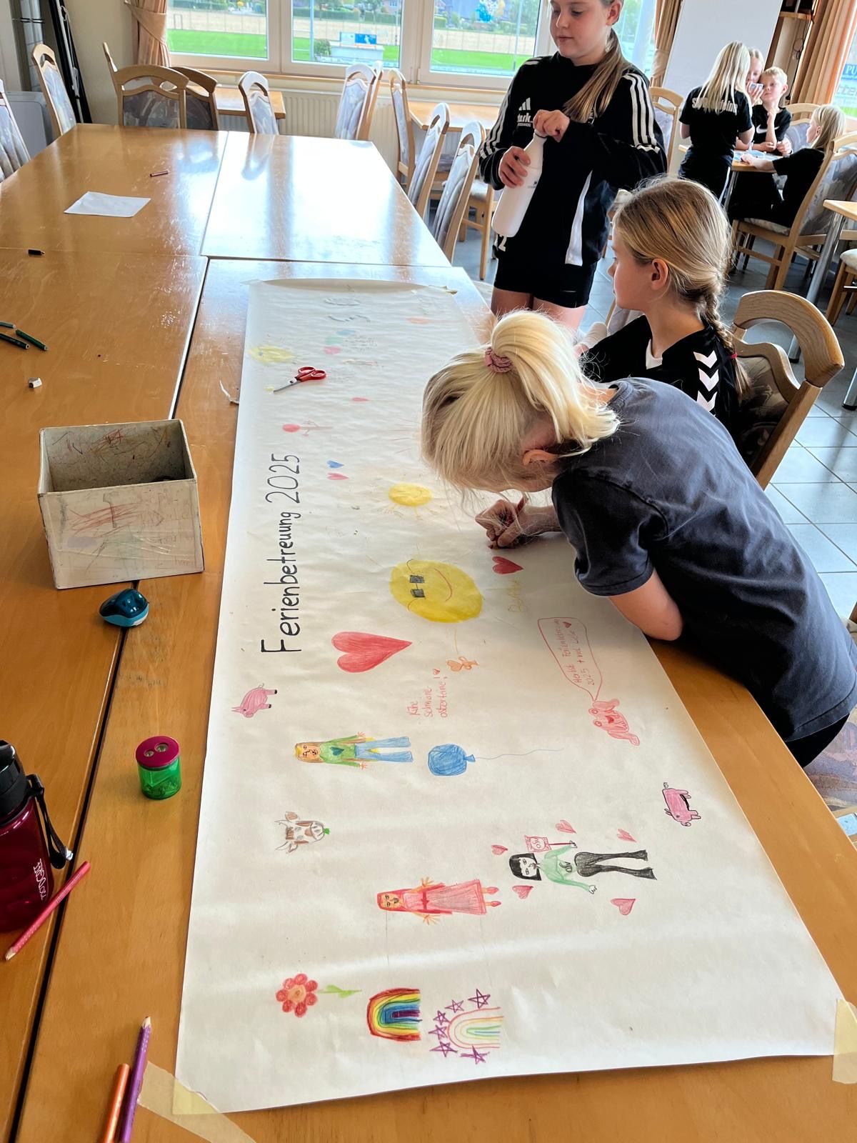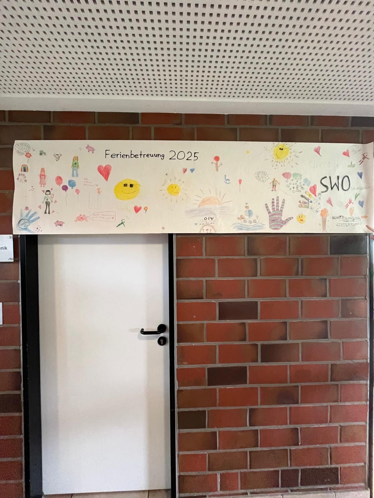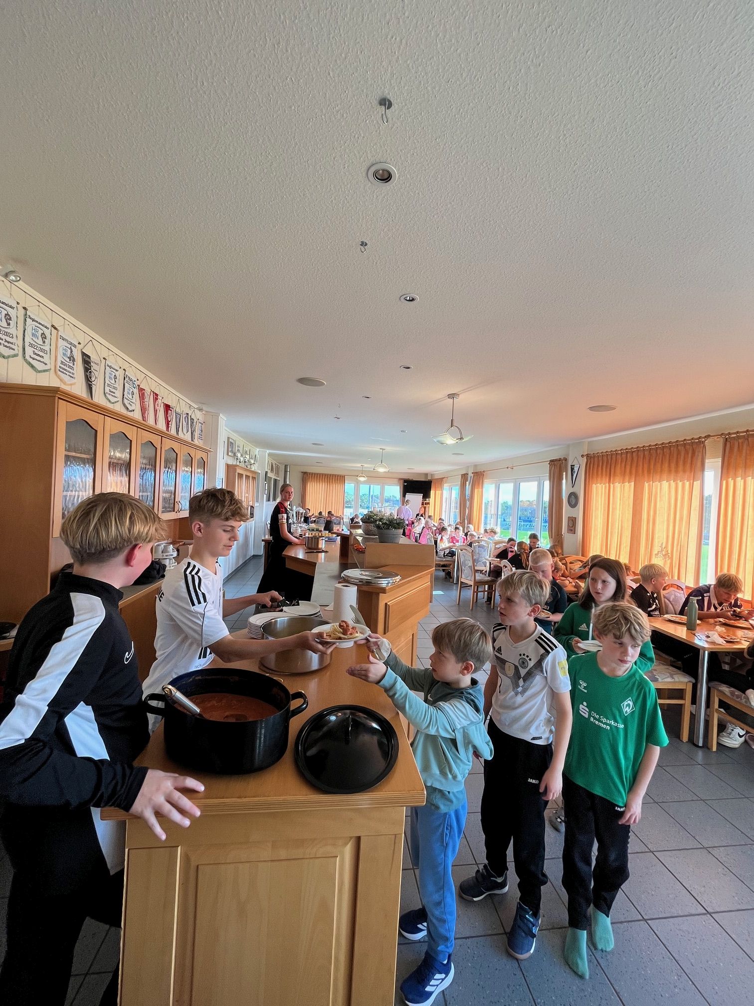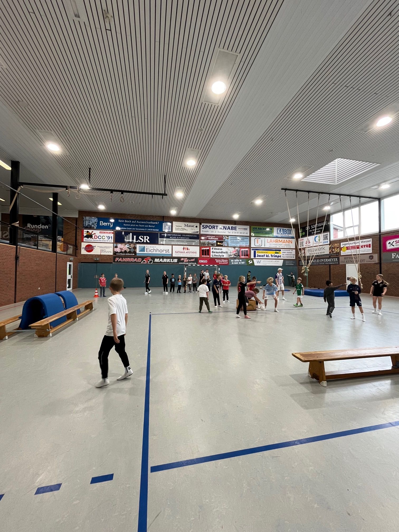 Auch am letzten Tag der diesjährigen Herbstferienbetreuung kamen alle Kinder wieder motiviert in die Halle. Nachdem wir im Morgenkreis das Geburtstagskind Simon gefeiert haben, konnten sich alle Kinder zuerst austoben. Oben im Clubraum konnte wieder eine Tapete bemalt werden und auch im Fitnessraum wurde fleißig geturnt. Nach dem Gruppenfoto gab es zum Mittag dann wie gewohnt für alle eine Mantaplatte und zum Nachtisch ein leckeres Eis. Am Nachmittag konnte dann weiterhin Fußball gespielt und sich ausgepowert werden. Nachdem mit Keksen neue Energie getankt wurde, haben alle gemeinsam aufgeräumt. Danach wurden noch ein letztes Mal Abschlussspiele wie Zombieball und Hase und Jäger gespielt.