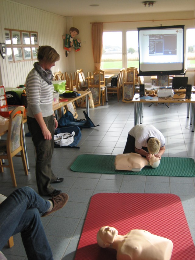 Am letzten Wochenende haben 7 OSVer den sog. Großen Erste-Hilfe-Kurs zum Ersthelfer im Osterfeiner Clubraum absolviert. Organisiert von der Handballabteilung wurde der 2-tägige Kurs von der der Erste Hilfe Ausbilderin Jutta Schutt (Mutter unserer Spielerin der 1. Damen Jessica Schutt) vom Deutschen Roten Kreuz geleitet. Die Teilnehmer (Kerstin Lübbehusen, Ursula Hillmann, Bianca Ihorst, Karla Adelmeyer, Roland Ottens, Hans-Jürgen, Andreas Westendorf) erlernten die Vorbeugung und das Erkennen von Verletzungen und Erkrankungen. Insbesondere auch deren Erstbehandlung sowie das Ergreifen von entsprechenden, richtigen und wirksamen Gegenmaßnahmen. Dies von der Behandlung von leichteren Verletzungen bis hin zur Reanimation bei Bewusstlosigkeit und Atemstillstand.