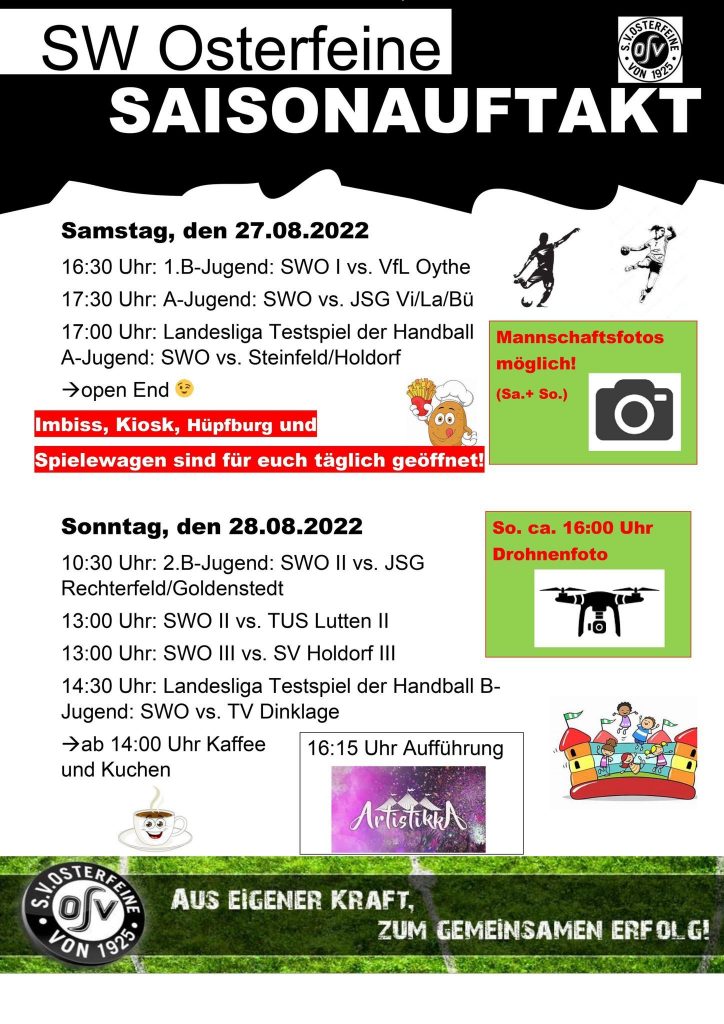 Um sich auf die kommende Saison mannschaftsübergreifend einzustimmen, bietet SW Osterfeine ein tolles Rahmenprogramm am Wochenende 27. / 28. August auf dem Sportplatz und in der Sporthalle in Osterfeine.