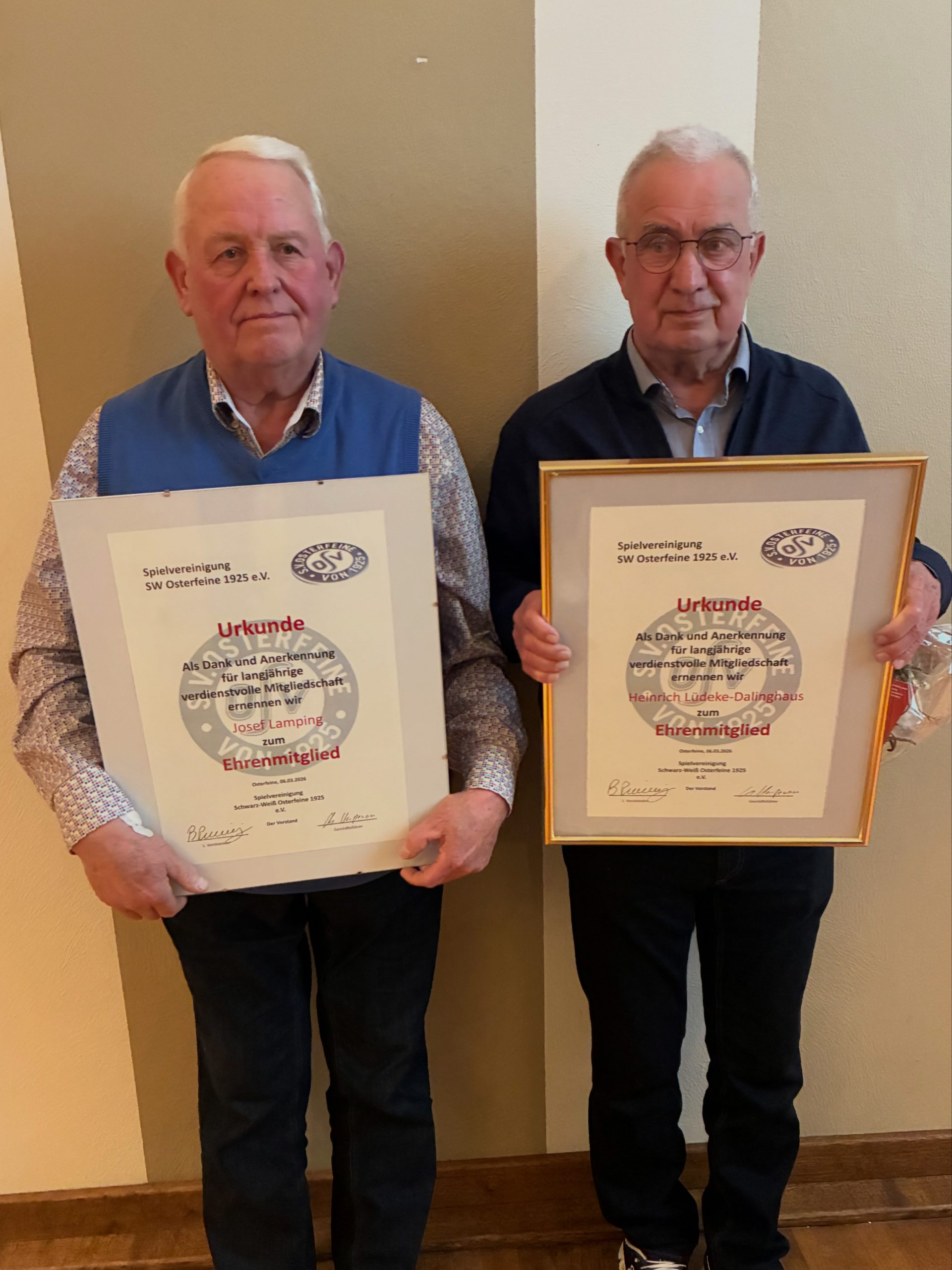 Eine besondere Atmosphäre im Saal herrschte beim Tagesordnungspunkt „Ehrungen“. Der Verein verfügt seit gestern Abend über zwei neue Ehrenmitglieder. Diese höchste Auszeichnung im Verein wurde an zwei prägende OSV-Persönlichkeiten verliehen: Josef Lamping und Heinrich Lüdeke-Dalinghaus!!