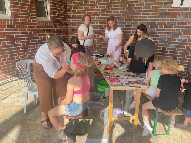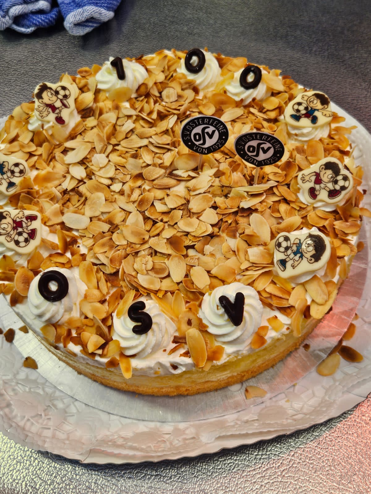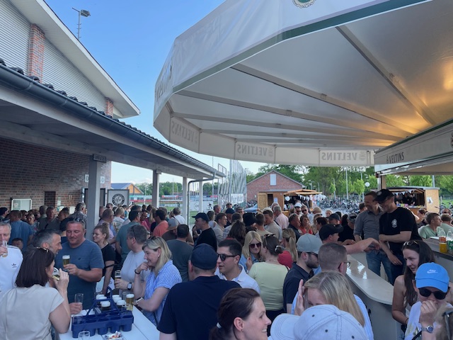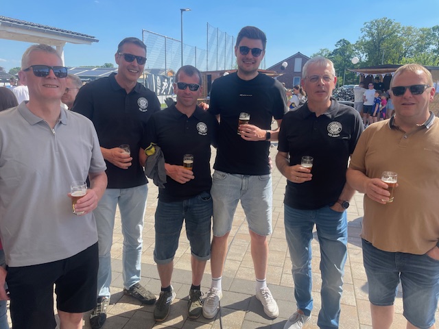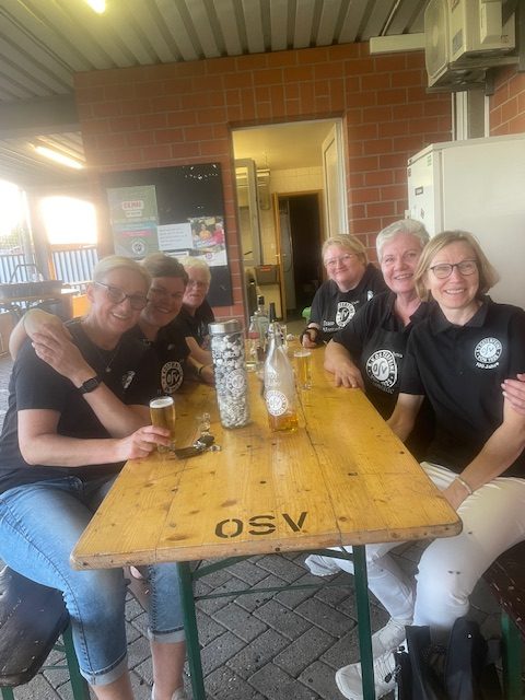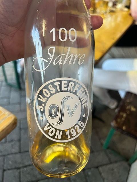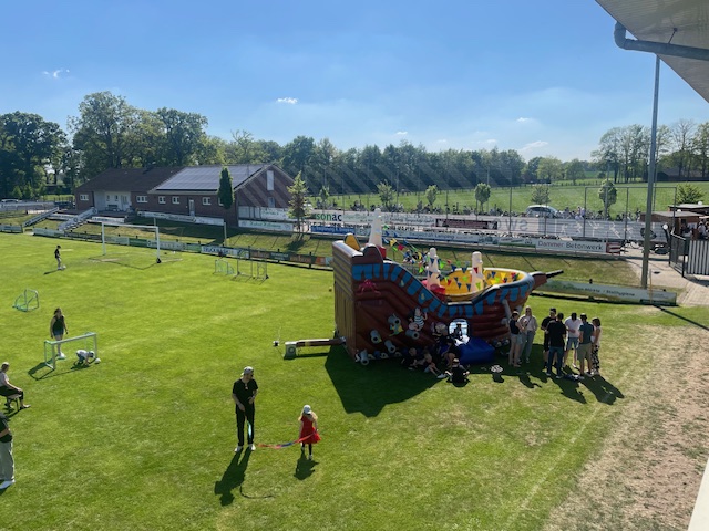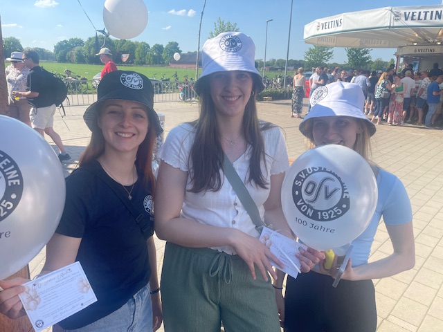 Nach einer, für viele OSVer kurzen Nacht, folgte der „Tag der offenen OSV-Tür“ am 1. Mai-Feiertag. Der Wettergott gratulierte auf seine Art und Weise zum Jubiläum und sendete strahlenden Sonnenschein und sommerliche Temperaturen. Ab 11 Uhr standen die Türen des OSV für alle Besucher offen. Die Anzahl der Besucher lässt sich allerdings nicht schätzen, da über den Tag verteilt dauerhaft ein großer Zulauf von Fahrrad-Gruppen das Osterfeiner Sportgelände ansteuerten. Die 1. Herren-Mannschaft stellte zur Mittagszeit einen schwarz-weiß-geschmückten Mai-Baum am Sportplatz auf. Für Kinder wurden diverse Spiel-Aktivitäten, z. B. eine große Hüpfburg, sowie ein Kinderschminken geboten. Neben dem Pavillion, dem Imbiss, der Kaffee+Kuchen-Tafel stellte sich der OSV-Fanshop unter Leitung von Marion Kalus als Verkaufsschlager heraus. Alles in allem ein toller Tag für den OSV, 100 Jahre nach dem offiziellen Gründungsdatum des Vereins (01.05.1925)!