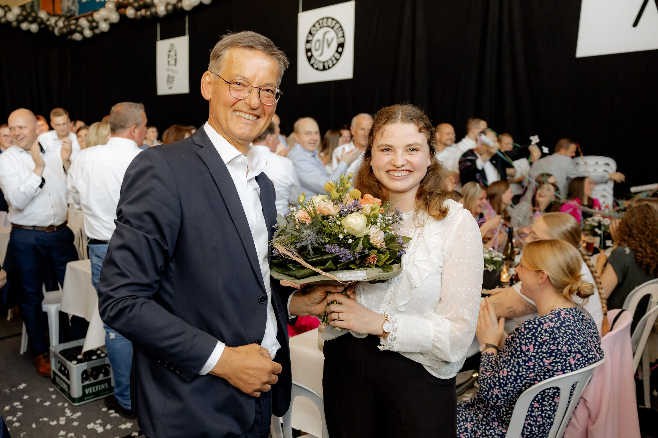 Rund 700 Besucher durfte der 1. Vorsitzende und Moderator des Abends, Bernard „Bubble“ Piening, in einer wunderbar geschmückten Osterfeiner Sporthalle begrüßen. Bevor das Fest-Programm begann, wurde es zunächst hoch emotional. Das Gedenken an besonders verdienstvolle verstorbene OSV-Mitglieder wurde mit Fotos auf der Leinwand untermalt, welches teilweise zu feuchten Augen führte.