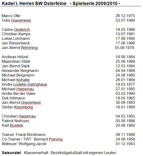 Mit einem Kader von 23 Spielern wird Trainer Böcki am 01.07.2009 die Vorbereitung auf eine der heißesten Spielzeiten seit Bestehen der Bezirksliga aufnehmen. Wer hätte vor ein paar Jahren schon gedacht, dass Osterfeine im Jahr 2009 zusammen mit Lohne in einer Liga spielen würde?! Bei weiteren „Krachern“ wie Steinfeld, Emstek oder Löningen darf, wie es die OV bereits in der vergangenen Woche getan hat, unverblümt von der stärksten Bezirksliga aller Zeiten gesprochen werden.
