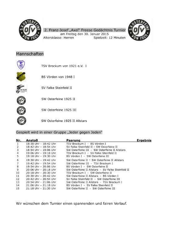 In Erinnerung an unseren langjährigen Betreuer unserer 2. Herrenmannschaft veranstaltet der Sportverein SW Osterfeine auch in diesem Jahr am Freitag, den 30. Januar 2015 in der Sporthalle Osterfeine ein Hallenpokalturnier für Mannschaften auf Kreisebene. Das Turnier beginnt um 18:30 Uhr. Neben unserer 2. Herrenmannschaft von Trainer Franz-Josef Ripke nehmen diverse Mannschaften aus der Nachbarschaft teil und wollen neben dem Spaß am gepflegten Hallenfußball in geselliger Runde an unseren verstorbenen Axel Freese erinnern.