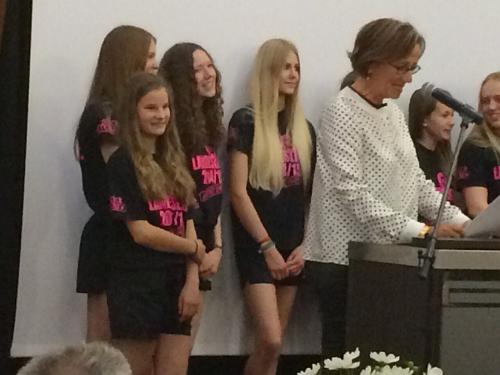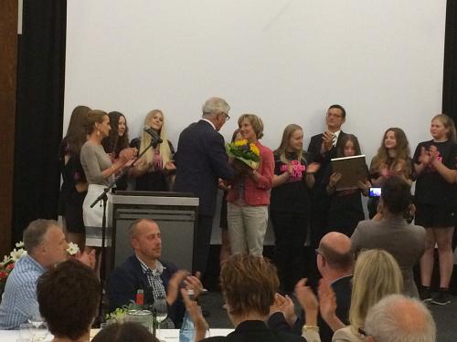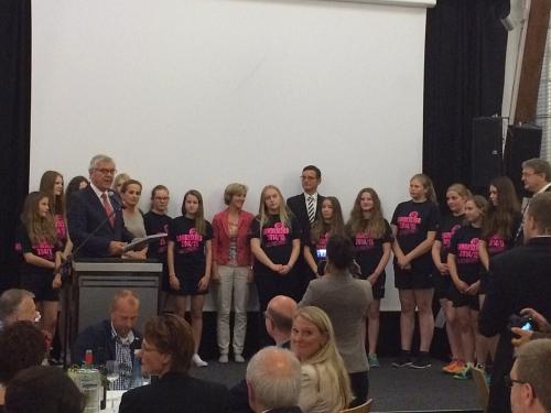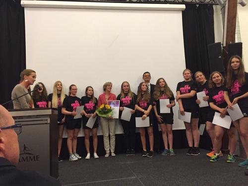 Aus den Händen des Vorsitzenden der Dammer Bürgerstiftung, Franz Grimme, erhielten unsere C-Jugendlichen gemeinsam mit ihrer Trainerin Carla Adelmeyer den mit 3000,– Euro dotierten Förderpreis der Dammer Bürgerstiftung als Auszeichnung für ihre tollen sportlichen Leistungen. Vor ca 100 Gästen hob die Laudatorin, Frau Christine Grimme, die einzelnen sportlichen Leistungen unserer Handballerinnen hervor. Ferner betonte sie ausdrücklich, dass diese Leistung besonders zu erwähnen ist, da sie ausschließlich mit Spielerinnen aus Osterfeine und Rüschendorf erzielt worden ist. Die Osterfeinerin und engagierte Unterstützerin von Schwarz-Weiß Osterfeine, Frau Gudrun Arkenberg, stellte allen Anwesenden unsere Sportlerinnen namentlich vor.