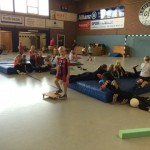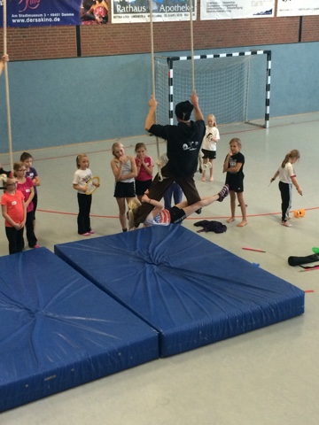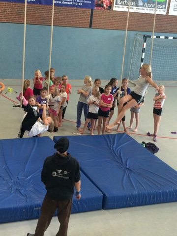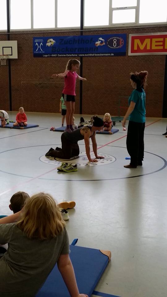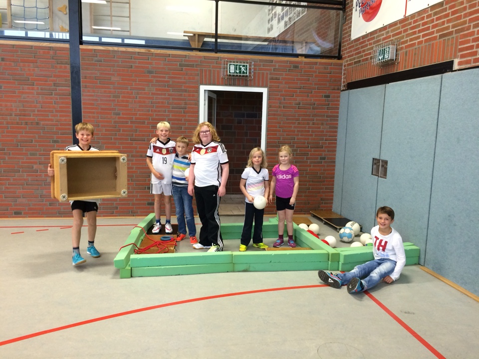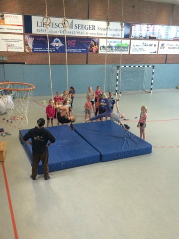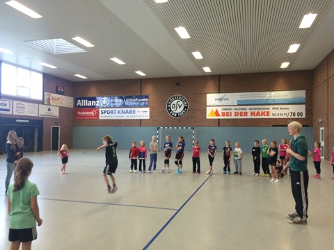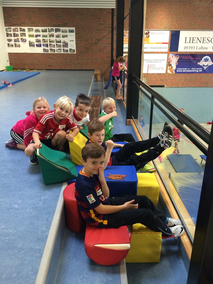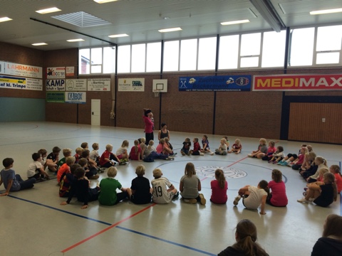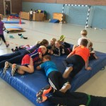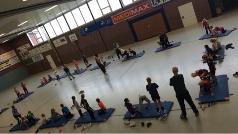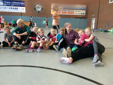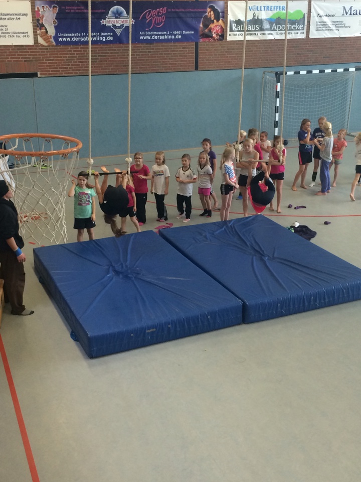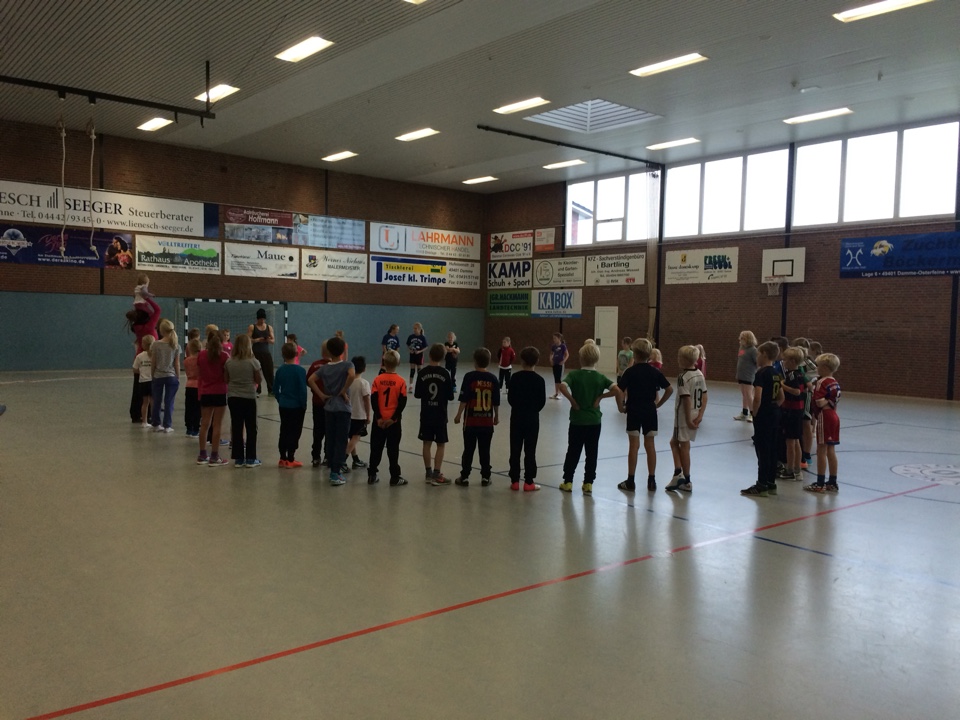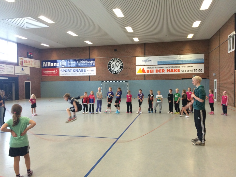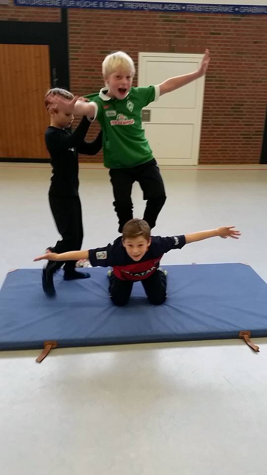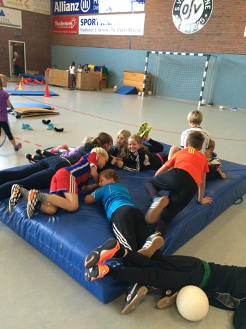 In der zweiten Woche der Herbstferien 2015 haben wir beim SW Osterfeine eine Ferienbetreuung für Kinder im Alter von 6 bis 12 Jahren angeboten. Die Kinder konnten schon ab 8 Uhr in die Sporthalle Osterfeine kommen und dann bis 16 Uhr bleiben. Jeden Mittag gab es um 12:30 Uhr Mittagessen, was teilweise schon um 12:28 Uhr zu der Frage „Wann gibt’s Essen? Ich hab Hunger!“ führte. Das Angebot wurde von den Eltern und Kindern im Umkreis so gut angenommen, dass wir zuletzt ganze 70 (!!) Anmeldungen hatten. Diese Anzahl von Kindern verlangte natürlich auch tatkräftige Betreuer, die wir in Anne Adelmeyer, Felix Piening und Anna-Lisa Zumwalde fanden. Auch Christina Hillmann und Hannah Kalus unterstützten uns am Freitag bei der „großen Überraschung“, doch dazu später mehr.