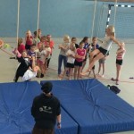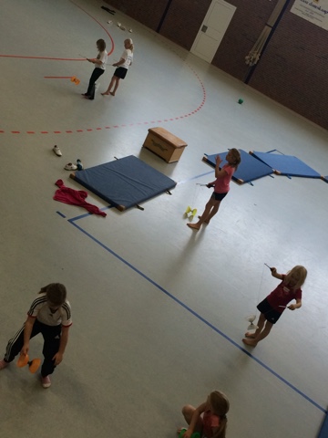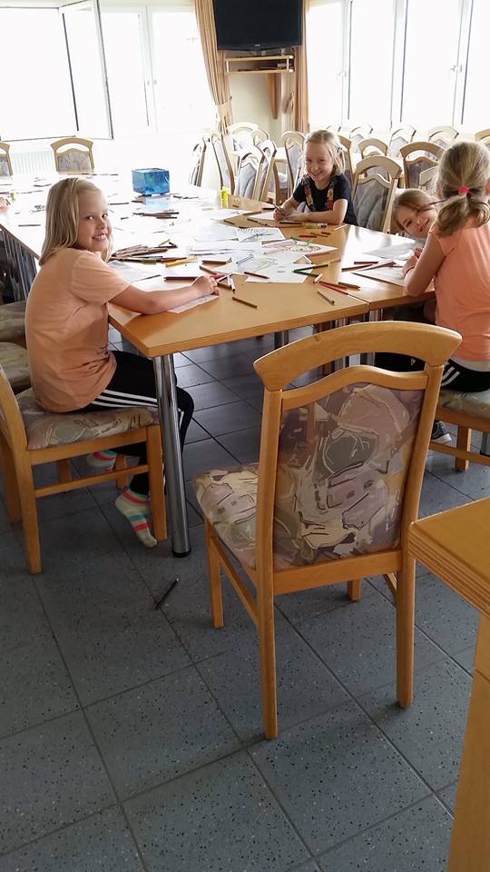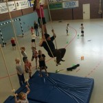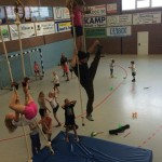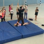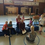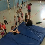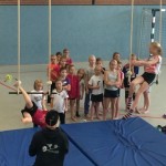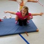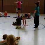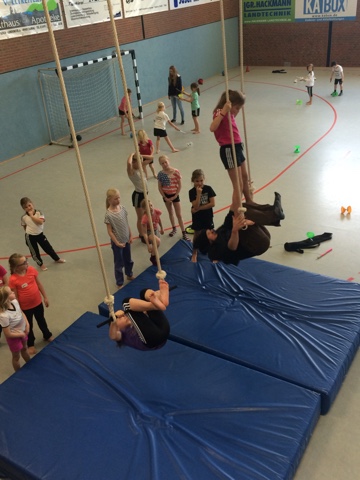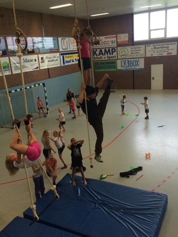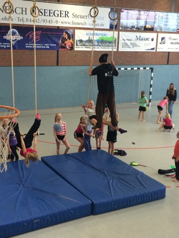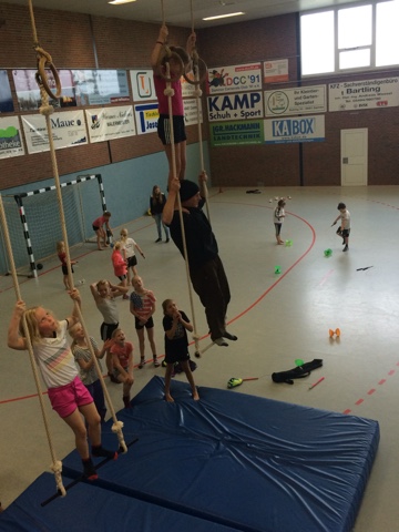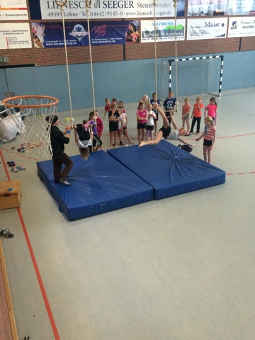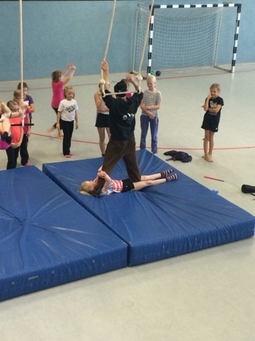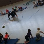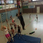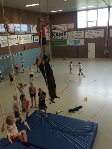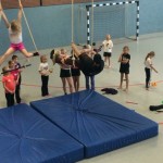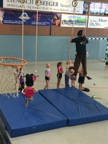 Für den Mittwoch hatten die Betreuer eine Überraschung angekündigt und spätestens als der allseits bekannte grüne Bulli auf den Parkplatz fuhr war allen klar: Die Überraschung hieß David Ebel. Mit seiner Frau Lana und Tochter Milla begeisterte er die Kinder vormittags wie nachmittags. Dabei wurden viele Pyramiden gebaut, Kunststücke am Boden wie am Trapez geübt und Diabolos durch die Luft gewirbelt. Nach einer Stärkung mit Nudeln und Würstchen haben wir dann am Nachmittag zusätzlich zu Davids Programm noch einmal Malen und Spielen angeboten. Am Ende des Tages waren alle Kinder sichtlich zufrieden und auch die Betreuer waren glücklich, dass ihnen die Überraschung gefallen hat.