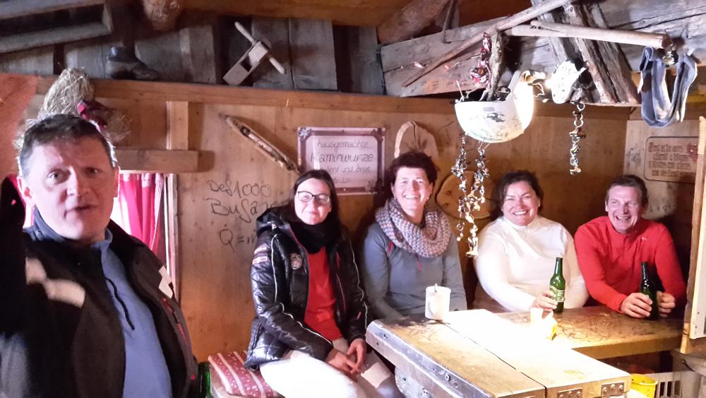 Zum Ausklang des Skitages wurde auf der Bielefelder Hütte mit Kind und Kegel Aprés Ski gefeiert. Für einige war es jedoch auch bereits das Einläuten der großen „Mondzaubernacht“ inklusive Sektempfang auf dem Berg anlässlich Ulrikes Geburtstag. Über den Morgen danach werden wir berichten…