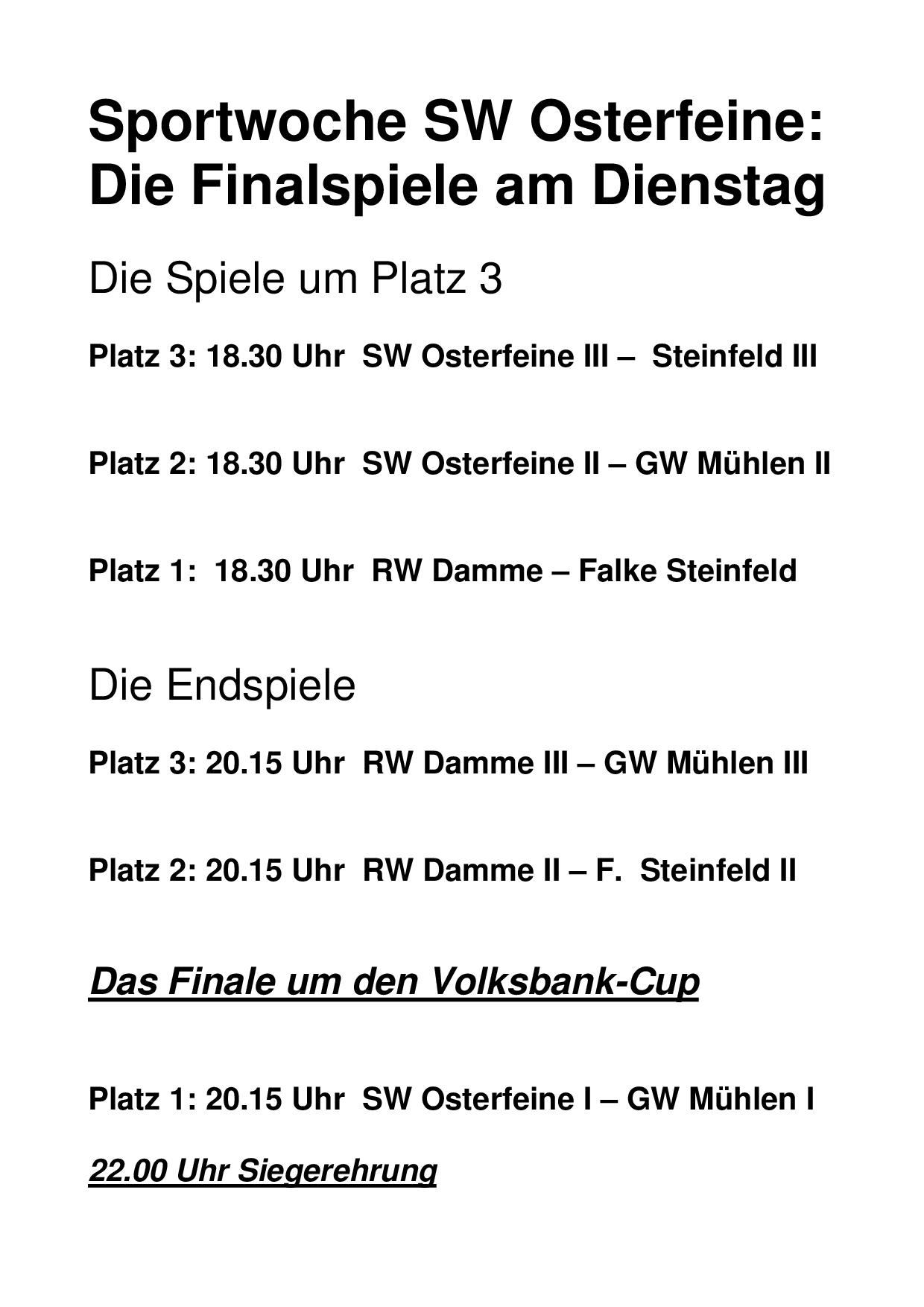 Morgen steigen in Osterfeine die großen Finalspiele der Sportwoche. Hierzu lädt der Sportverein alle Fans und Sportverbundene herzlich ein.