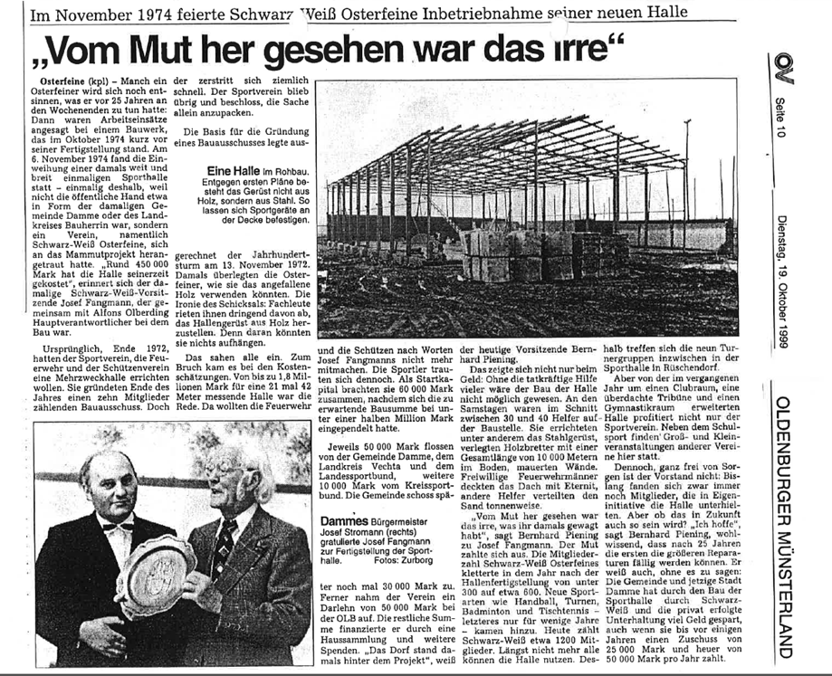 Im Jahr 2019 verfügt der Sportverein SW Osterfeine bereits 45 Jahre über eine vereinseigene Sporthalle. Auch hier dürfte der beigefügte OV-Ausschnitt wichtige Informationen besonders auch für unsere jüngeren Mitglieder enthalten.