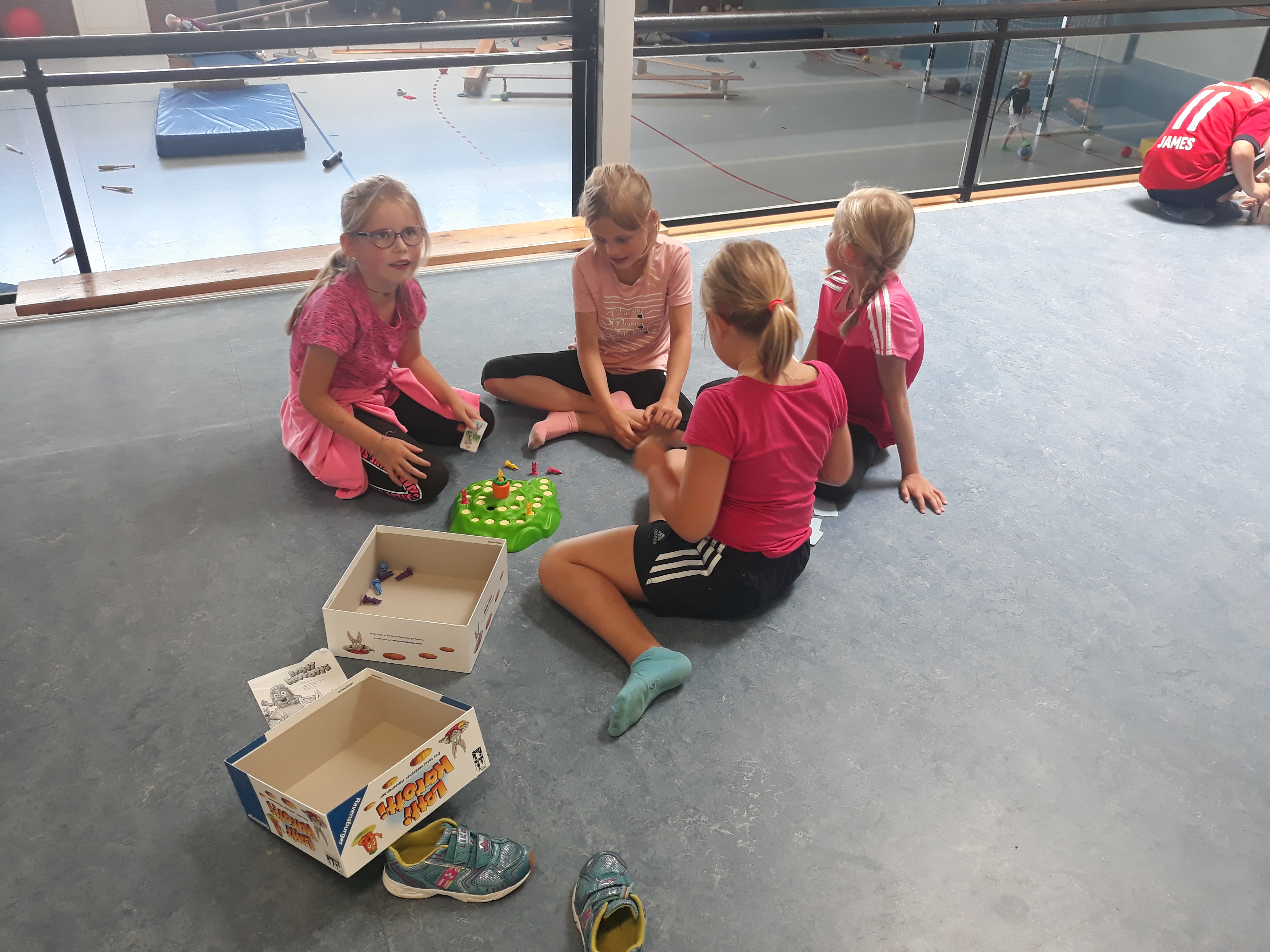 Am zweiten Tag der Ferienbetreuung mussten wir das Programm ein wenig umstellen. Da David Ebel leider kurzfristig verhindert war, wurde der Vormittag größtenteils dazu genutzt kleinere und größere Spiele gemeinsam in der Halle zu spielen. Bis auf ein paar kürzere Ausflüge nach draußen, haben die Kinder aufgrund des schlechten Wetters und teilweise Dauerregens, die meiste Zeit in der Halle verbracht.