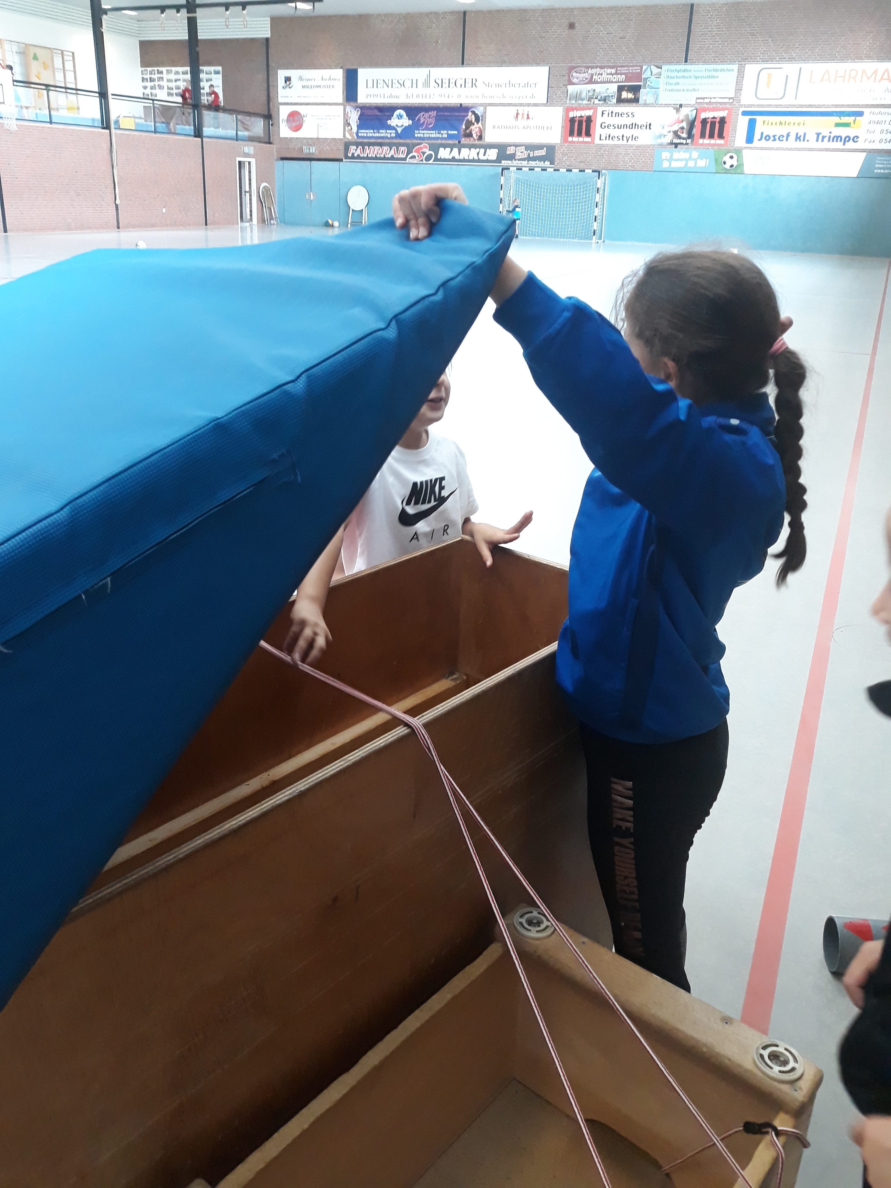 Am vierten Tag der Ferienbetreuung wurde die Halle geteilt. Wer wollte konnte auf der einen Hallenhälfte mit einigen Betreuern gemeinsam Spiele, wie z.B chinesische Mauer oder Hase & Jäger, spielen. In der anderen Hallenhälfte konnten die Kinder frei spielen und bauen was sie wollten.