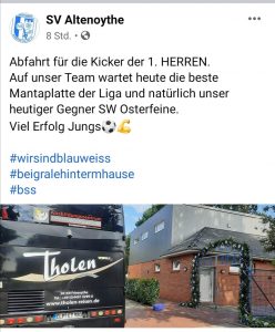 Die erste Herren des SV Altenoythe hat sich gestern mit dem Bus auf dem Weg zum Spiel in Osterfeine gemacht. Groß war die Vorfreude auf die „beste Mantaplatte der Liga“.