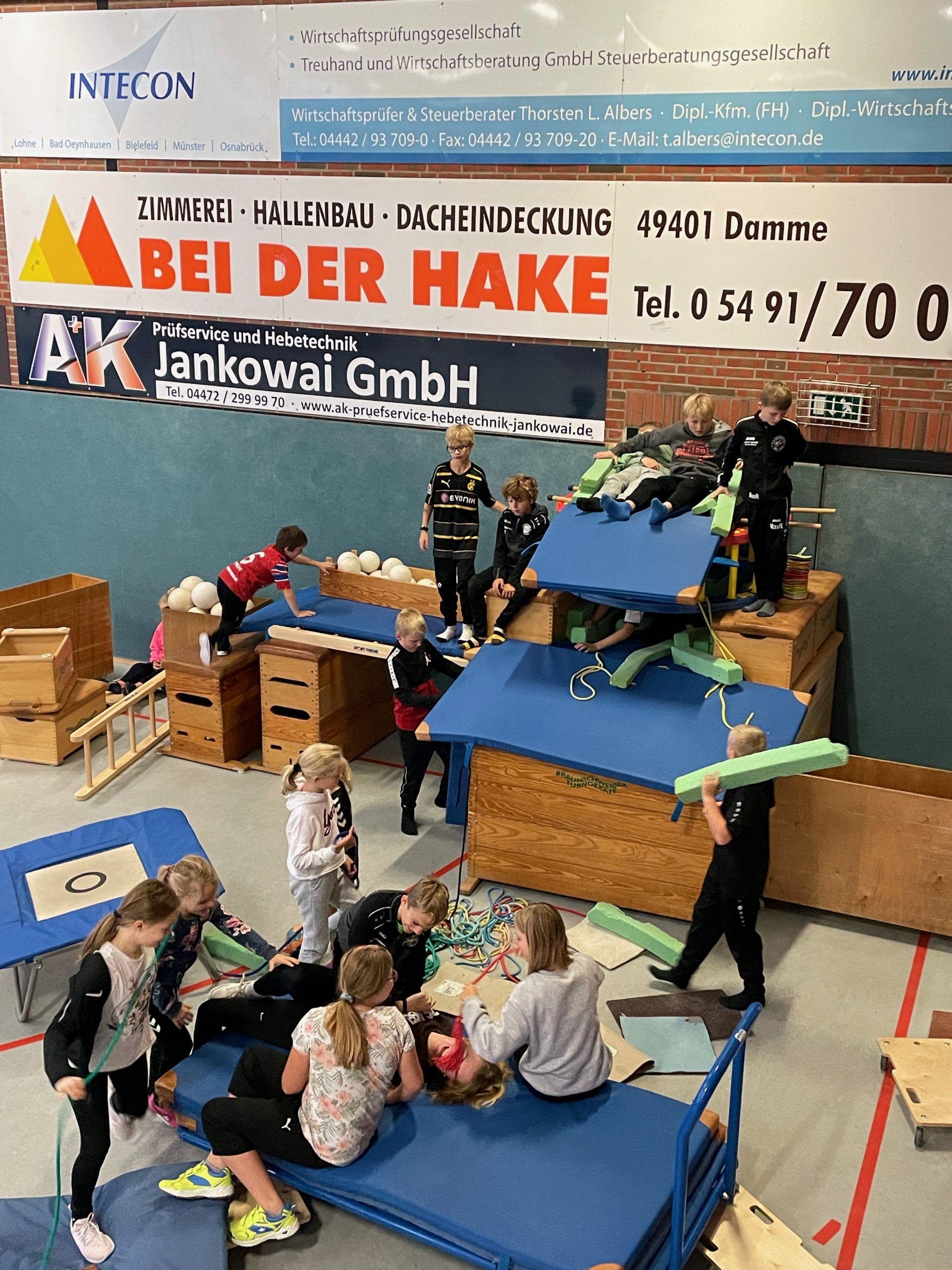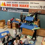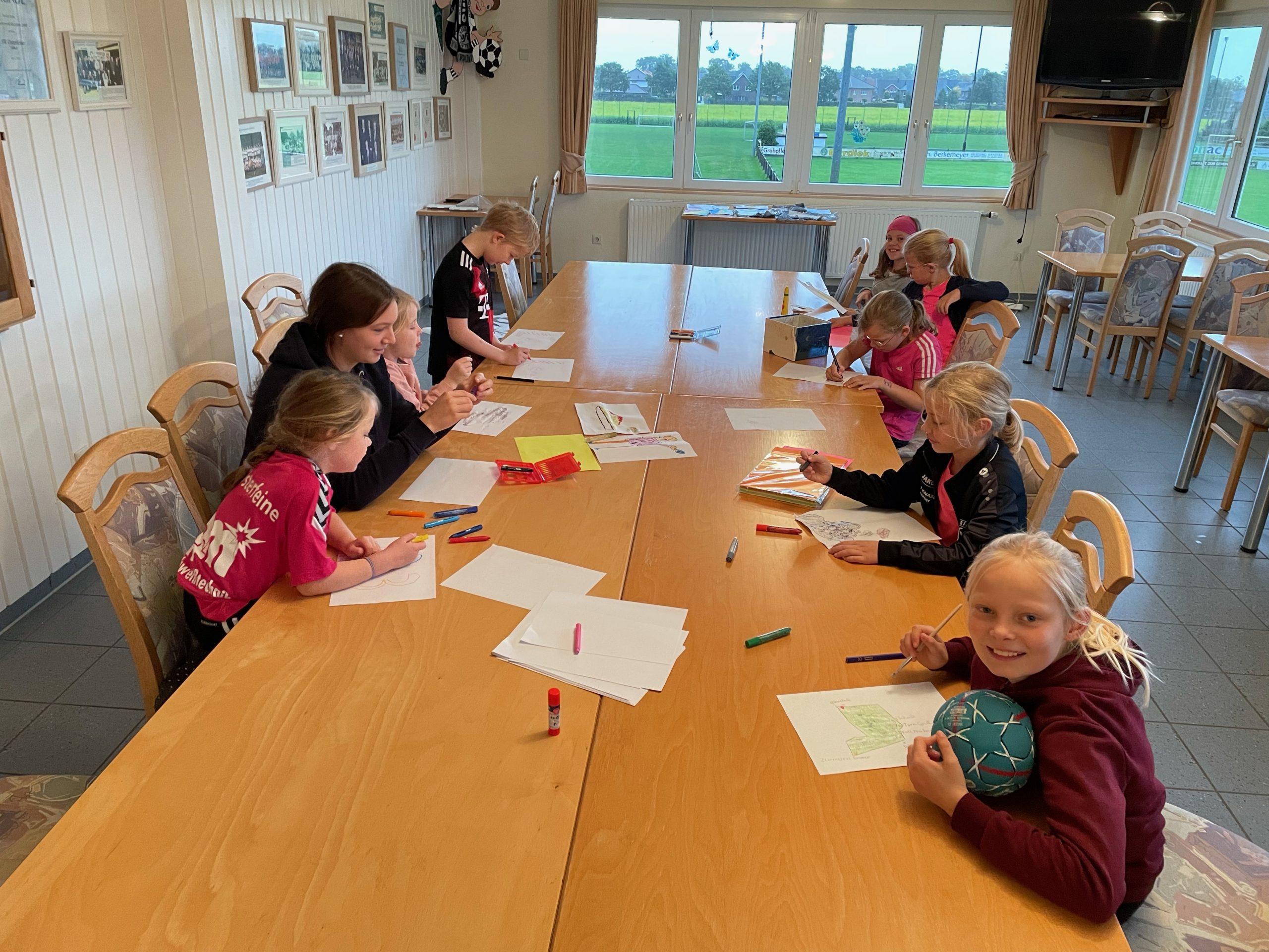 Leider hat das Wetter heute nicht so gut mitgespielt. Das war aber auch kein großes Problem, denn heute Vormittag stand das Chaosspiel auf dem Programm. Wie der Name schon sagt, ging es in der Sporthalle drunter und drüber. Die Teams haben alles gegeben um zuerst den 50. Zettel zu finden. Außerdem haben wir unser Malprojekt fertiggestellt. Dieses kann man nun auf der Tribüne der Sporthalle bewundern.