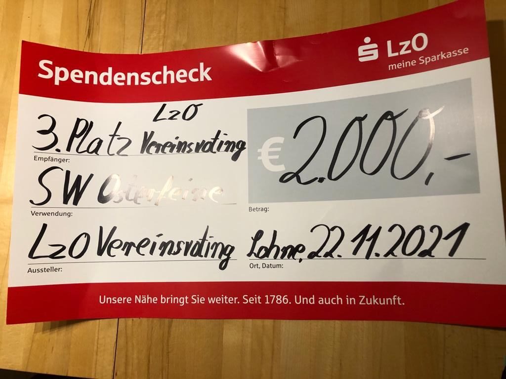 – Danke LZO: Am vergangenen Montag konnten unsere Vereinsvertreter nun den Scheck für die erfolgreiche Teilnahme am LZO-Vereinsvoting in Empfang nehmen. Aus den Händen der LZO-Verantwortlichen Annette Vetter und Alfred Müller wechselten 2000,00 Euro für die Jugend unseres Vereines nach Osterfeine. Ein liebes Dankeschön an die LZO und ebenso an alle OSVer, die für unseren Verein abgestimmt haben.