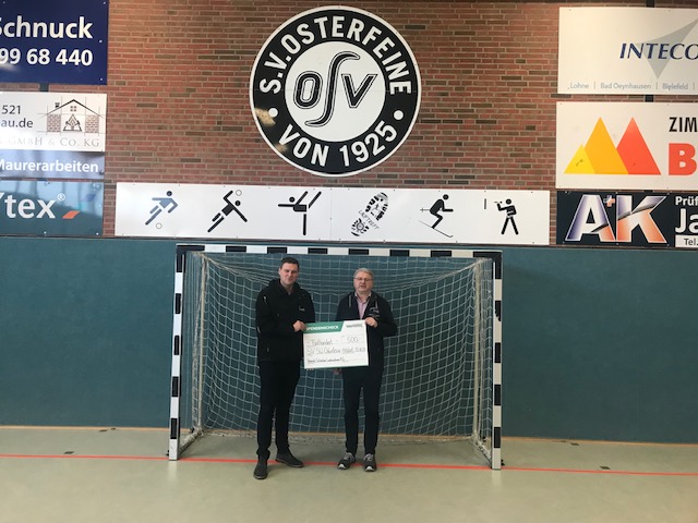 Andreas Schwietering, Verkaufsberater bei der Heinrich Schröder Landmaschinen KG , übergab unserem 1. Vorsitzenden Bernard Piening eine Spende über 500€ für die OSV-Jugendarbeit.