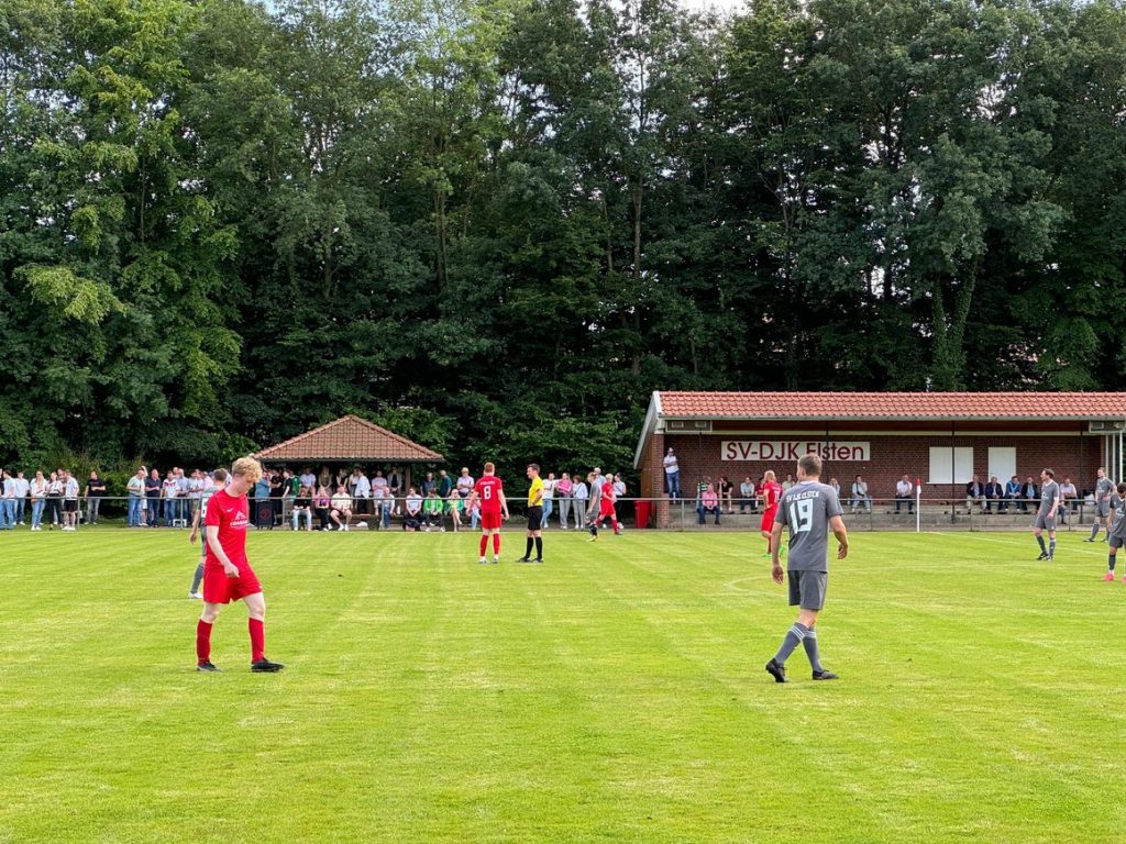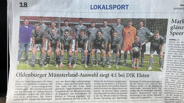 Die erste Herren von DJK Elsten, vergangene Saison mit unserer ersten Herren in der Bezirksliga, richtete ein Einlagespiel gegen eine bunt zusammengestellte OM-Auswahl aus. Die Spieler der OM-Auswahl spielen im Liga-Alltag von der Regionalliga bis zur Kreisliga. In Elsten haben sie es schon richtig erkannt, denn was ist eine OM-Auswahl ohne Spieler von SW Osterfeine?! Da wir in Osterfeine zum Glück über einen hohen Fundus an „Fußball-Legenden“ verfügen, schickten wir die geballte Erfahrung nach Elsten! So bildeten Berthold Klatte, Maxi Stärk, Michi und Christian Harpenau das Grund-Gerüst der Auswahl.