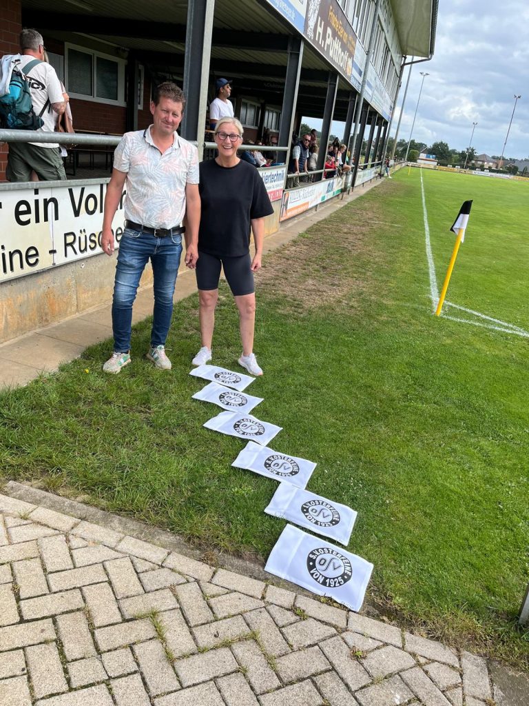 Eine tolle Idee setzte Marion Kalus nun am vergangenen Sonntag zum 1. Heimspiel unserer 1.Mannschaft in die Tat um. Kurz or Spielbeginn überreichte Marion – Danke Marion und Danke für Deine Vielseitigkeit im OSV — am Sonnabend stand sie noch im Tor unserer 1. Damenmannschaft —unserem Vorstandsmitglied Jörg Lange frisch genähte Wimpel für die Fahnenstangen auf Platz I. Ganz dezent prägt der Schriftzug – Eure Fans halten immer zu Euch – die neuen Fähnchen. Und Glück gebracht haben die neuen Fahnen auch noch beim 1. Heimsieg am Sonntag.