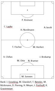 Zu Beginn sah es auch ganz danach aus, als wenn dies gelingen sollte, eine unglückliche Situation brachte jedoch die Gäste zurück. In der 51. Minute brach Damme nach einem Konter über unsere rechte Abwehrseite bis zur Grundlinie (und darüber hinaus) durch. Da der Ball deutlich über der Linie war hörten fast alle Beteiligten schon auf zu spielen, der Ball wurde kurz zurückgespielt und Damme drückte den Ball über die Linie. Der Schiedsrichter hatte den Ball weder im Aus gesehen, noch gepfiffen und stand es plötzlich 2:1. Dies zeigt uns mal wieder, wie wichtig es ist immer weiterzuspielen, bis der Schiedsrichter abpfeift.