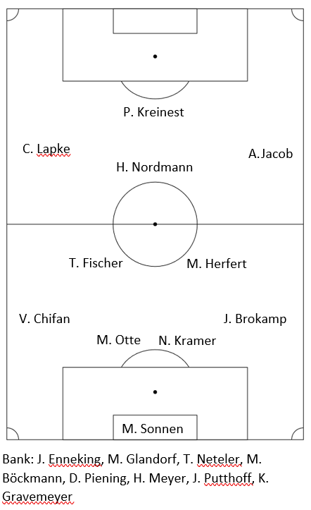 Im bewährten 4-2-3-1 wollten wir von Beginn an mit Aggressivität überzeugen, hohe Ballgewinne erzielen und anschließend schnell auf Angriff umschalten. Und dieser Plan sollte in Hälfte eins voll aufgehen. Alle waren direkt voll im Spiel, brachten Lautstärke auf den Platz und unterstützten sich in jeder Situation. Defensiv brannte überhaupt nichts an, weil nach einem verlorenen Zweikampf direkt nachgesetzt wurde und der jeweils nächste Mitspieler umgehend schaltete und den Ballführenden unter Druck setzte. Im Spiel nach vorne agierten wir zielstrebig und gaben so der Dammer Defensive permanente Beschäftigung.