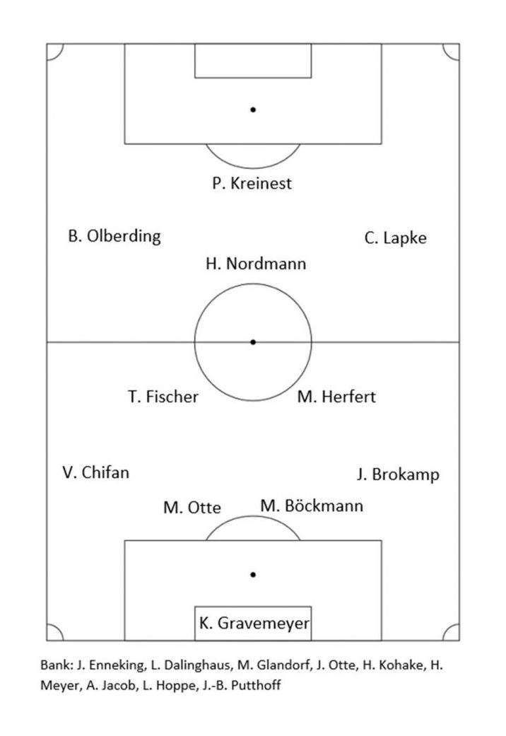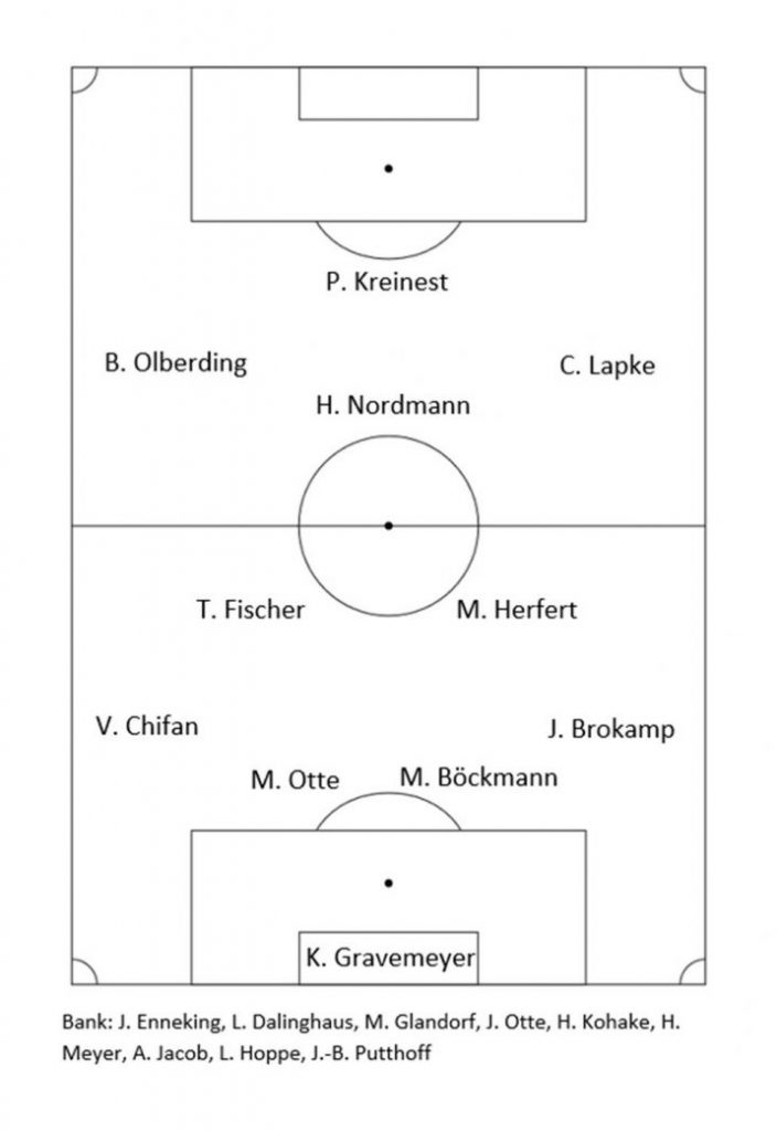Der dadurch in der Innenverteidigung eingesetzte Mattes Glandorf konnte sich nur wenig später durch eine wahre Energieleistung auszeichnen, als er nach einem weiteren langen Ball über unsere Kette einen Sprint von der Mittellinie bis zum eigenen Tor anzog und den Ball für den bereits geschlagenen Kevin Gravemeyer von der Linie kratzte.