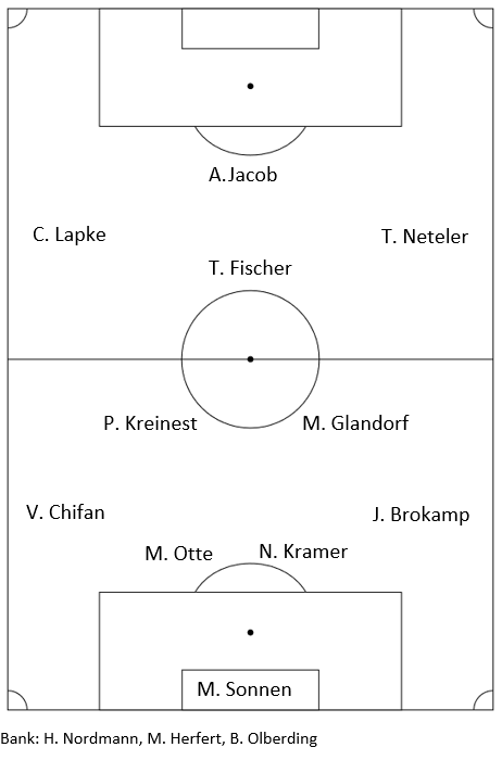 Cloppenburg versuchte noch einmal sich aufzubäumen, doch den Schlusspunkt setzte Clemens mit seinem zweiten Treffer. Nach einem Einwurf auf der rechten Seite machte Arne den Ball zunächst fest und spielte dann Paul im Zentrum an. Dieser schickte seinen Passgeber in Richtung Grundlinie und die resultierende Flanke konnte der erneut eingelaufene Clemens am zweiten Pfosten per Volley zum Endstand verwerten (90. Minute).