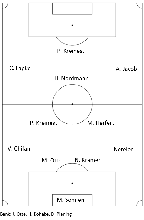 Damit war der Torreigen wiedereröffnet. Nur drei Minuten später spielte Paul mit einem Flankenwechsel auf Tom, der legte sich den Ball zurecht und flankte aus dem rechten Halbfeld auf Arne am ersten Pfosten. Dieser verarbeitete den Ball, drehte sich und versenkte im langen Eck (65. Minute).