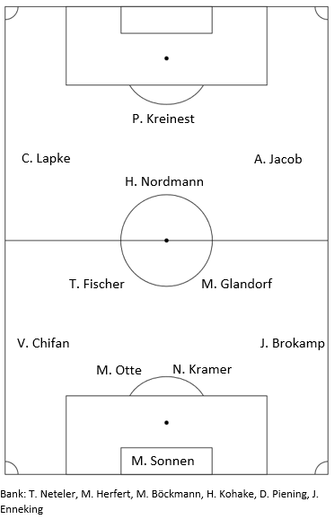 Den Schlusspunkt der ersten Halbzeit setzte erneut Clemens. Fischer spielte den freistehenden Harry im Mittelkreis an, der drehte direkt auf und platzierte seinen Steilpass so, dass Clemens zwischen Verteidiger und Torwart eine kleine Ballberührung reichte, um den Ball an beiden vorbei zu bugsieren und ins Netz zu befördern (44. Minute).