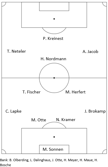 Den Schlusspunkt der Partie setzte der ebenfalls eingewechselte Jannis Otte, der nachdem Arne auf der rechten Seite lang geschickt wurde nach dessen Querpass völlig frei vor dem Kasten auftauchte, den Ball kurz annahm und aus kurzer Distanz den 11:1 Endstand erzielte (87. Minute).