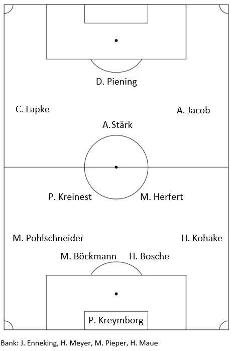 Die etwas höhere Verteidigungslinie bot uns gleichzeitig die Möglichkeit Kontersituationen auszuspielen. Eine solche Kontersituation hätte beinahe zum Ausgleich geführt, doch an der Strafraumgrenze packte Neustürmer David „Woltemade“ Piening die Nervosität und der Ball flog am leeren Ziel vorbei. Wir sind uns sicher, dass David in den kommenden Spielen die Kaltschnäuzigkeit seines Frisurenvorbilds für sich entdeckt und ihm ein solcher Fauxpas nicht noch einmal passieren wird.