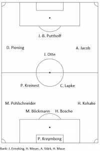 In der Folge zog Stei/Mü/Kro sich etwas weiter zurück und verlegte sich nun vollends auf das Konterspiel. Es gelang uns jedoch nicht aus unserem vermehrten Ballbesitz Gefahr zu erzeugen. Es blieb das Problem der fehlenden Anspielstationen und Läufe in die Tiefe. Um doch noch den Druck zu erhöhen stellten wir auf eine Dreierkette um und brachten so einen zusätzlichen Spieler auf die vorderste Linie.