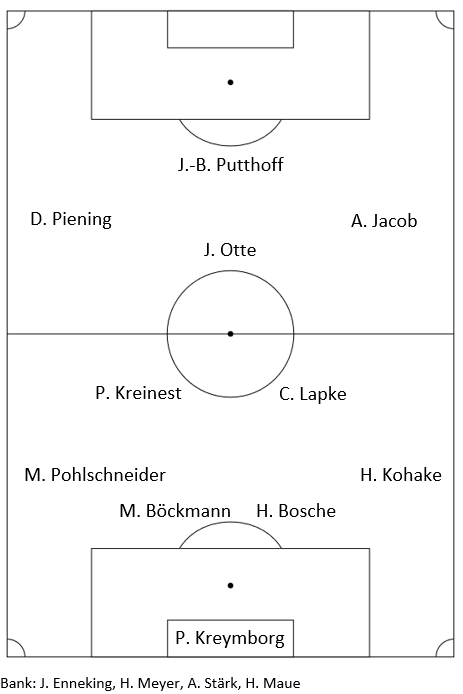 Noch vor dem Anpfiff musste sich dann mit Arne Stärk der nächste Spieler zumindest kurzfristig ins Lazarett verabschieden. Für ihn rückte Jan-Bernd Putthoff nach langer Verletzungspause und ein paar Kurzeinsätzen erstmals wieder in die Startelf.