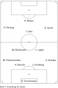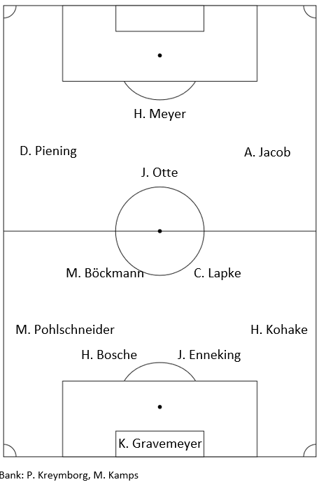Unsere Kontrahenten, die zwischenzeitlich Probleme hatten überhaupt Spiele bestreiten zu können, treten mittlerweile verstärkt durch B-Jugendspieler an. Und einer dieser B-Jugendspieler tat uns direkt zu Beginn richtig weh. Bereits in der siebten Minute legte er sich einen Steilpass mit dem Rücken zum Tor an Bosche vorbei und startete durch. Auch Jarle konnte ihn nicht mehr einholen und so schob er unbedrängt an Katze vorbei zur 0:1 Führung ein.