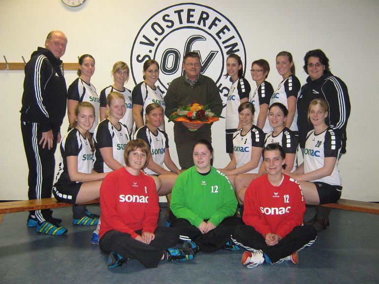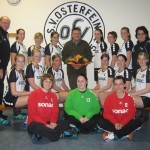 Standortleiter Klemens Kreymborg (Werk Haverbeck) wurde nun zum Gruppenfoto mit unseren Damen eingeladen und fühlte sich sichtlich wohl in der charmanten Umgebung. Neben dem Heim- u. Auswärtstrikotsätzen sagte die Fa. Sonac auch weitere Unterstützung zu und wünschte der Mannschaft alles Gute und viel Erfolg in der Landesliga.