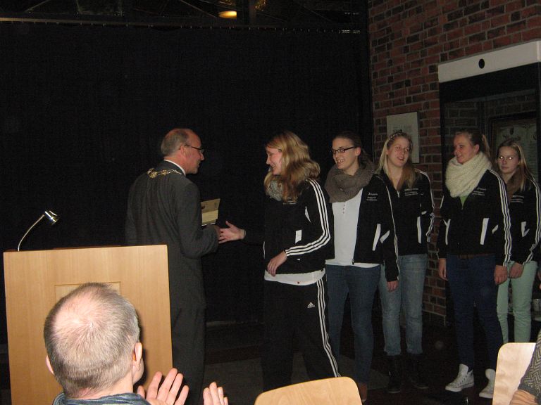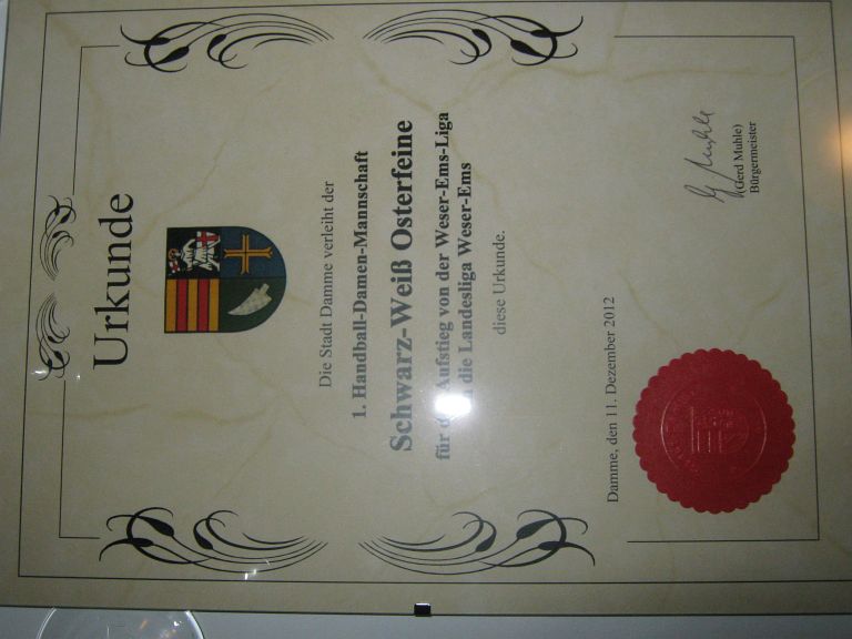 Am 11.12.12 war für die 1. Damen ein ganz besonderer Tag. Wir waren eingeladen zur Sportlerehrung der Stadt Damme. Wir wurden zusammen mit der A-Jugend geehrt für den Aufstieg in die Landesliga Weser-Ems. Natürlich gab es neben der schönen Urkunde auch einen kleinen Bonus für die Manschaftskasse. Vielen Dank dafür. Wir hoffen, dass wir der Ehrung gerecht werden und in den nächsten Wochen die Landesliga halten können. In diesem Sinne nochmal vielen Dank für diese Ehrung, für die wir vom Vorstand vorgeschlagen wurden !