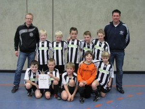 Durch den Kreisschiedsrichterobmann, Mike Otte, welcher in seiner Funktion als Vorstandsmitglied des NFV Kreis Vechta die Siegerehrung vornahm, wurden lobende Worte, insbesondere an die aktiven Jugendspieler, ausgesprochen. Mike Otte zeigte sich erfreut über die qualitativ sehr guten Leistungen der Spieler. Schließlich wurde unserer Mannschaft die Urkunde über den ersten Platz bei dieser Endrunde II überreicht, wobei das abschließende Siegerfoto natürlich nicht fehlen durfte. Insgesamt darf sich die Mannschaft darüber freuen, zu den besten acht F-Jugendmannschaften des Kreis Vechta im Rahmen dieser Hallenkreismeisterschaft zu gehören.