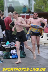Geschwommen wurde im angenehm beheizten Freibad (23°C), allerdings mussten die Athleten nach dem Verlassen des Wassers bei 9°C kaltem Wind ordentlich in die Pedalen treten, um warm zu werden.
